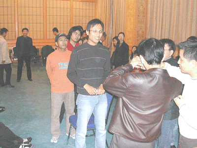 D組的表演者正在努力的描述,猜測者絞盡腦汁得想象著描述物,其他組員們給他們加油。