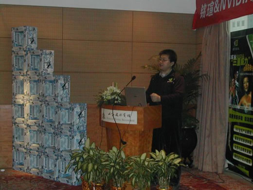 隨著銘瑄&NVIDIA全國經銷商會的召開,大家對NVIDIA中國區渠道經理侯宇濤先生已經非常熟悉,侯先生就NVIDIA的產品情況給大家做了詳細的培訓,在前幾次培訓三重威力的基礎上,這次還重點強調了2006年NVIDIA即將推出的G70系列顯卡及先進的Purevideo視頻技術。