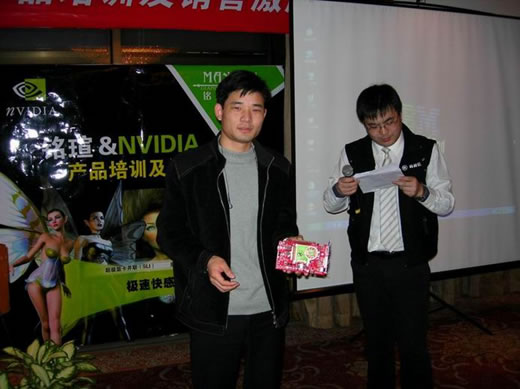 這次經銷商會的互動活動也是相當成功,抽獎、有獎問答及現場拍賣一系列活動使得現場氣氛十分熱烈。幸運的經銷商抽得銘瑄極光系列顯卡一張。NVIDIA侯宇濤先生為其頒獎。