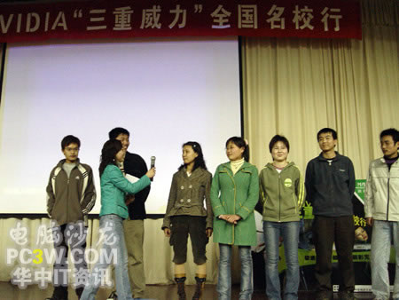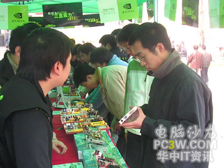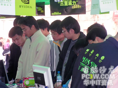 隨著上午放學時間的到來,武漢大學桂園產品演示區這邊的人流量也多了起來,巡展場面達到了今天的最高峰;鸨膱雒嫔踔吝B小編自己也沒想到。路過的同學們紛紛走過來欣賞和體驗NVIDIA及銘瑄顯卡所帶來的震撼效果。
