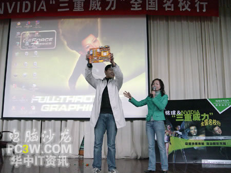 壓軸大獎即將揭幕,商科集團武漢天行電腦總經理徐進先生親自抽取了本次活動的一等獎。在抽出一等獎后,他還激動的表示,特別設立一個特等獎,將一塊NF4 SLI的主板作為特別獎勵,由獲得一等獎的這位MM抽出。
