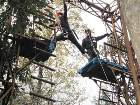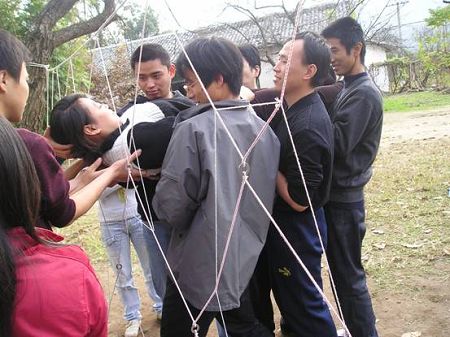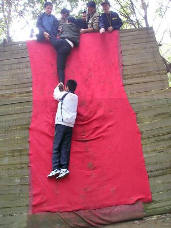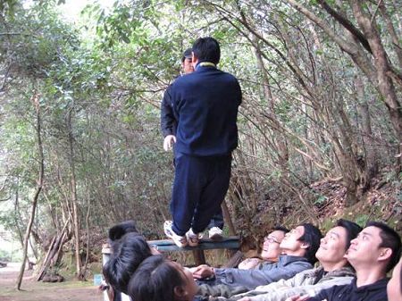 “中國龍”隊正以優美的身姿體驗高難度的“信任背摔”項目