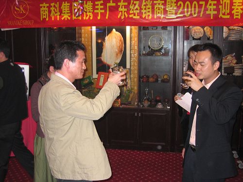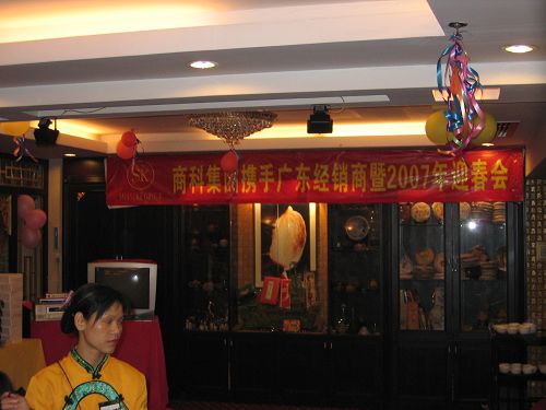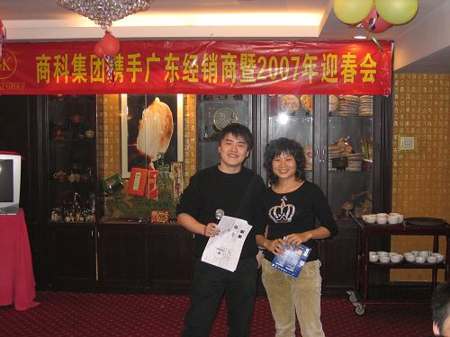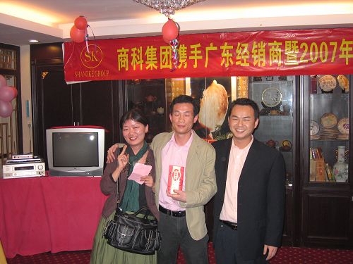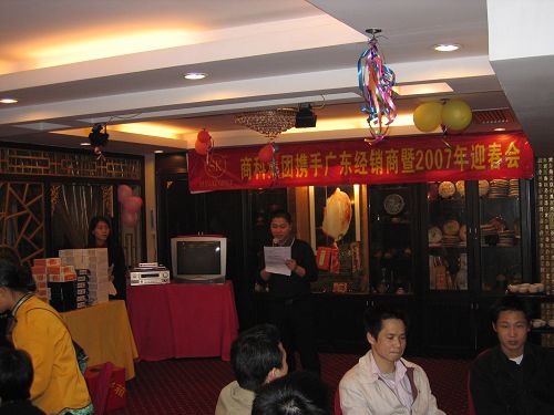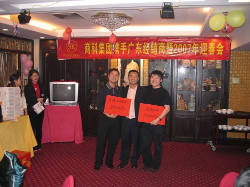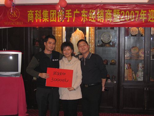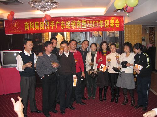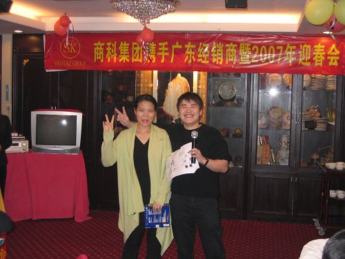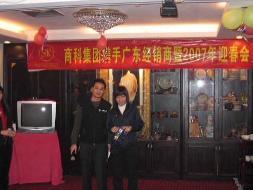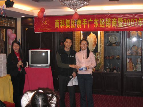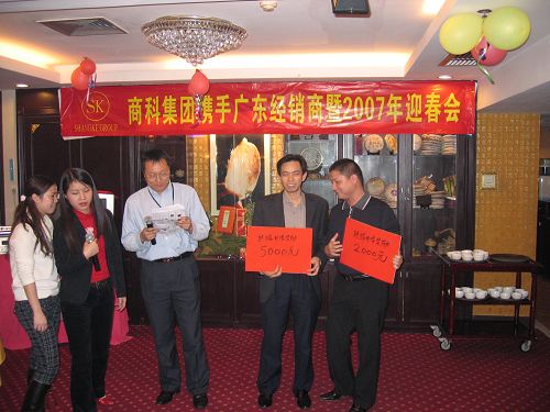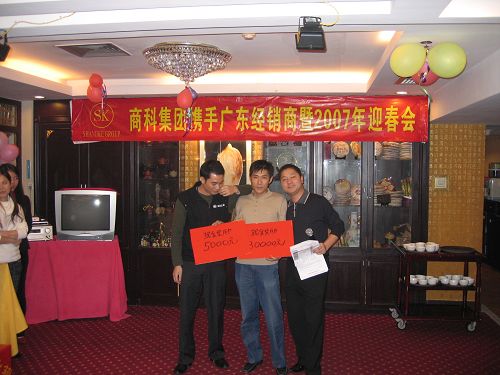 2月1日廣州商科為了答謝經銷商在過去的一年中給予的支持和厚愛,在廣武酒店舉辦了"商科集團攜手廣東經銷商2007年迎春會",與會的不僅有廣州的經銷商還有商科集團各事業部的經理.本次除頒發了"2006年度優秀個人貢獻獎" "2006年度優秀合作伙伴獎"外還進行了幸運大抽獎,現場氣氛異常熱烈……