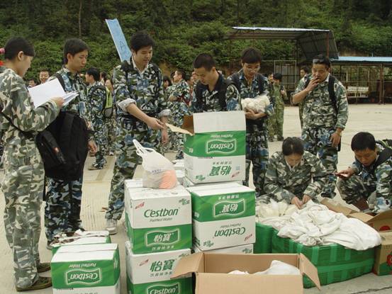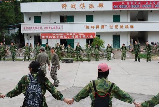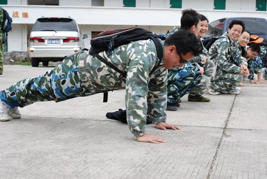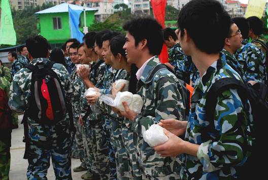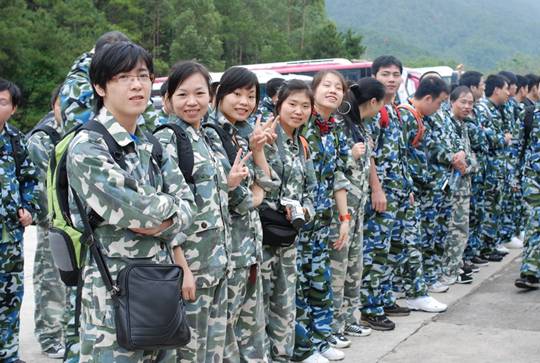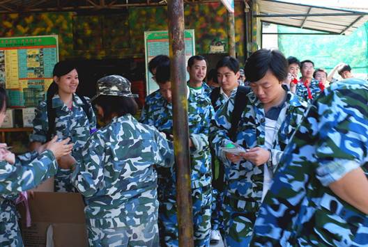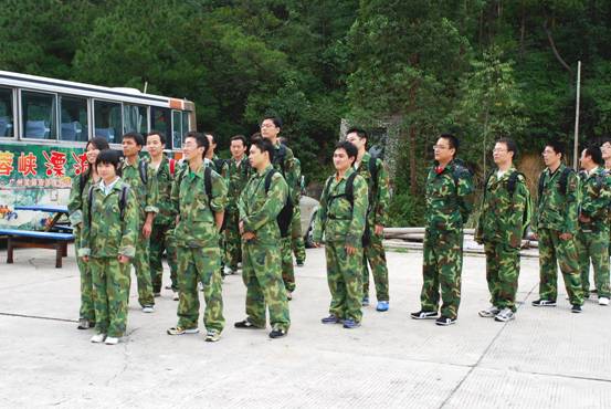 圖說:到達山頂的拓展基地后,員工們換上了精神的、統一的迷彩服