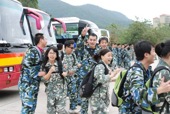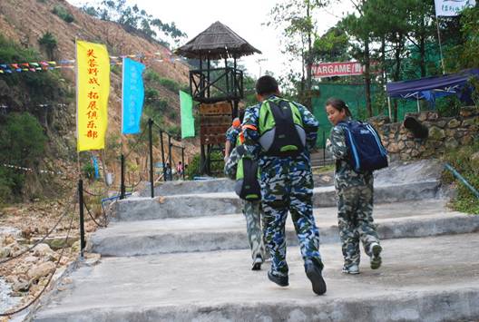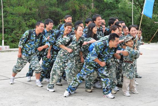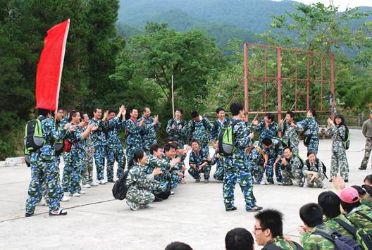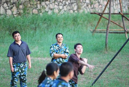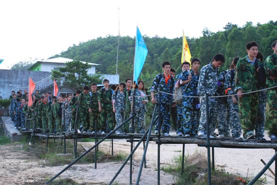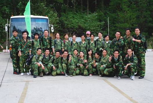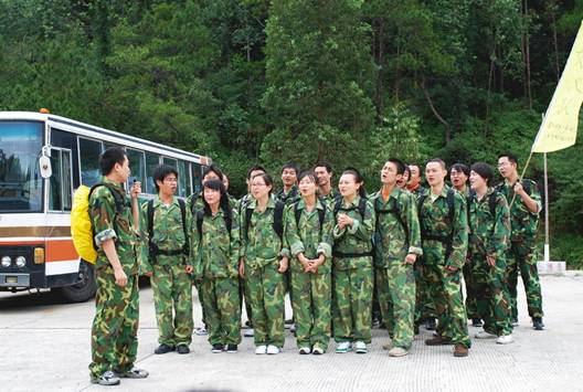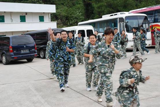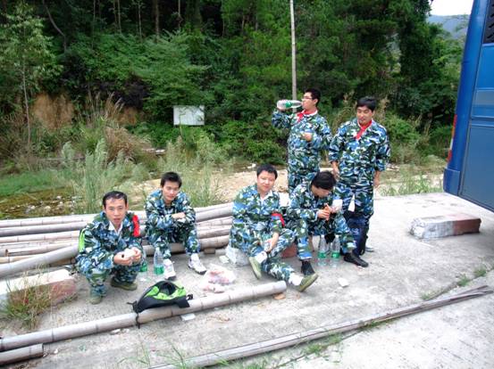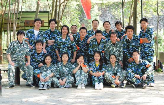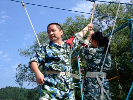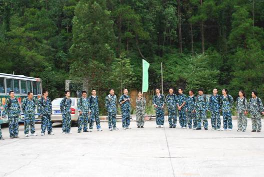 在到達花都芙蓉度假村之后,首先入住酒店,稍事休息和調整。 10點整,全體員工再次集合,乘坐大巴來到山頂的拓展訓練基地。 在到達基地后,大家換上基地準備好的迷彩服,正式開始了為期兩天的拓展訓練活動。