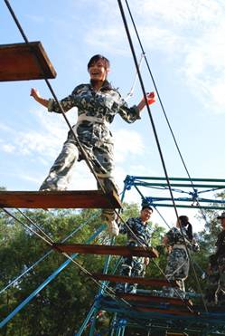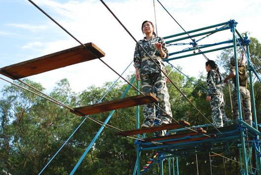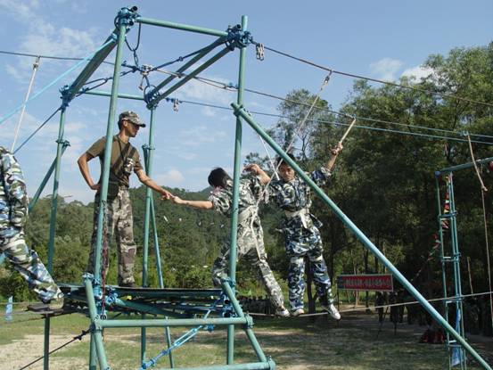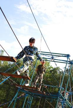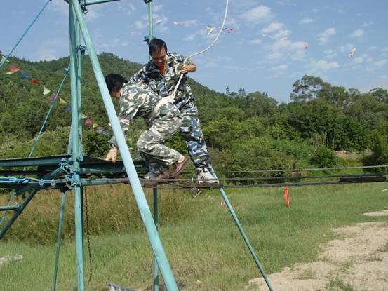 飛奪瀘定橋。這個項目是從高空的木板橋上通過,木板的間隙比較大。看似簡單,但是很多人站上去,雙腿就開始不由自由的哆嗦,這很能鍛煉人的勇氣哦。 這個項目讓許多人有一點害怕,但是當有的同事在上面感到恐懼的時候,下面的同事齊心協力的為他加油打氣,增加他的信心和勇氣。在大家的鼓勵下,同事們一一通過了這個項目。
