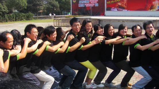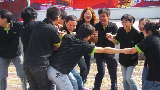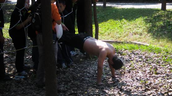 第二個是“人椅”。教練讓大家圍成圈,每個人的手都跨過一個人搭在前面人的肩膀上,然后一起坐在后面人的膝蓋上。開始所有人都覺得不可能完成的任務,可當我們下定決心,打破男女隔閡一起往下蹲時才發現,這是件非常容易且不費任何力氣的任務。原來,只要我們能夠緊緊團結在一起,齊心協力,沒有什么完成不了的事情!