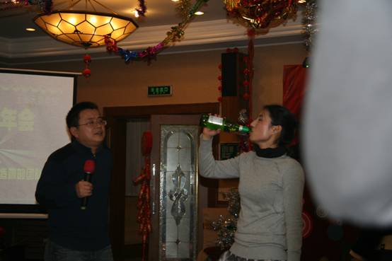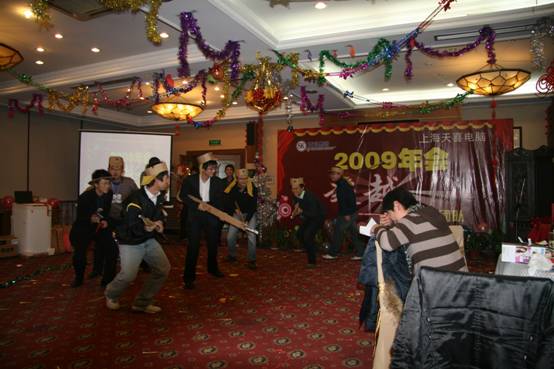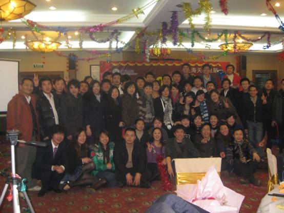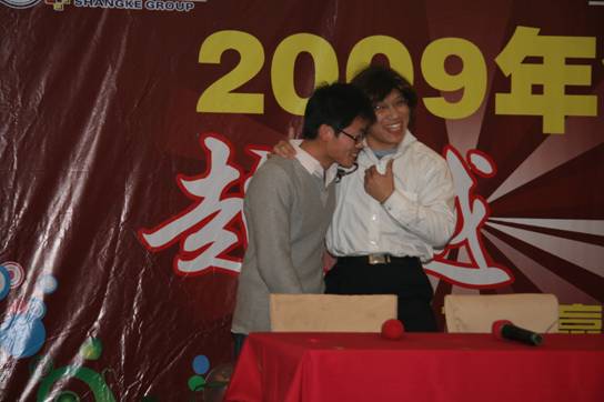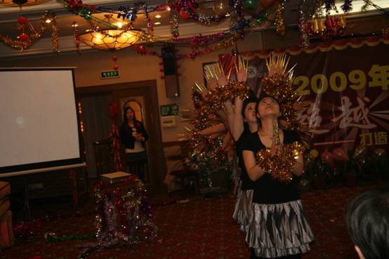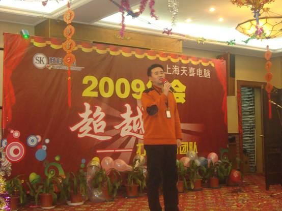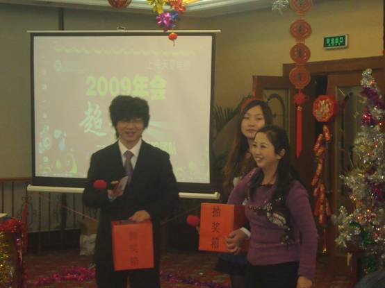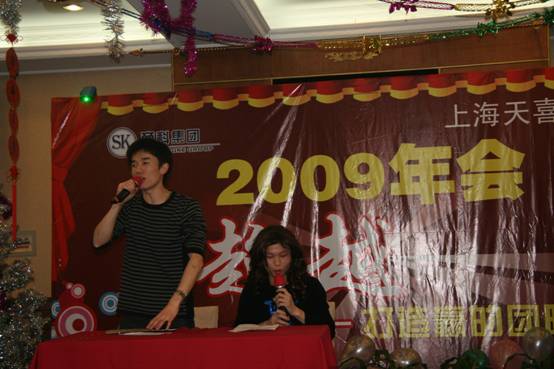 20091223,商科集團上海天喜公司送走09,迎來10。這次年會以“超越——打造贏的團隊”為主題,超越寓意在于——超越競爭對手、超越過去取得的成績、超越自我。晚會還未開始,就看到臺下一個個翹首以待。