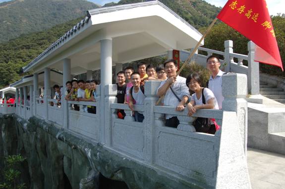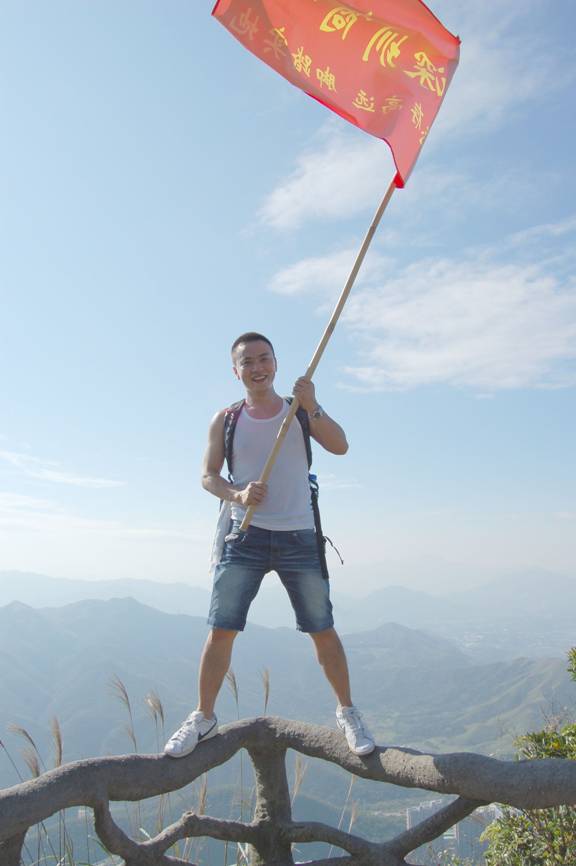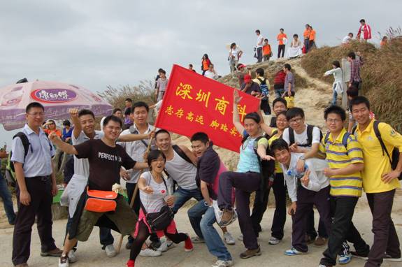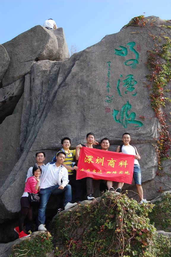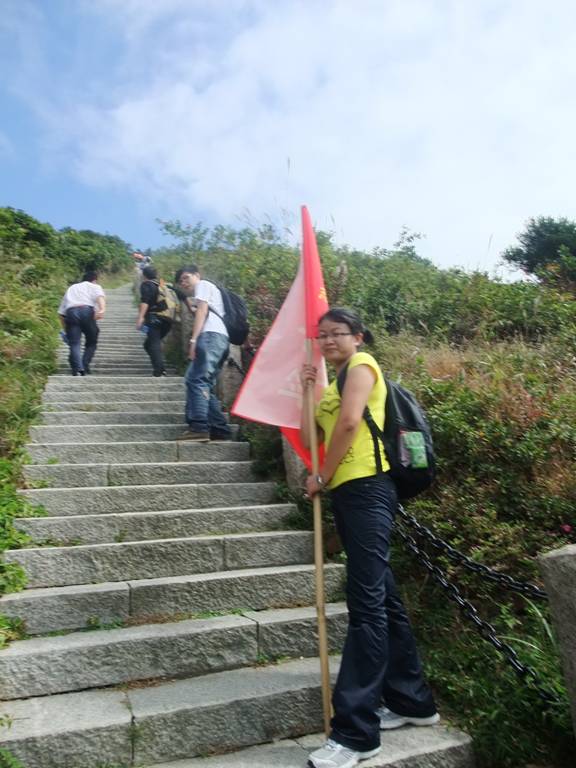 “深圳商科的紅旗在鵬程第一峰迎風飄揚----志存高遠,腳踏實地!” 歷盡千辛萬苦終于到了山頂,低頭看看那長長的臺階,心在跳,腿在抖,人到底還是上來了,“會當凌絕頂,一覽眾山小”,看著遠處的高樓大廈,有很強的成就感。
