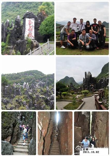 當天下午三點多我們又來到玉石林景區,它之所以叫玉石林是因為山上的石頭屬于玉白色,不同于昆明的花崗巖石林;一路行去,處處石林矗立、石芽裸露、奇峰突兀、石筍石柱狹縫密布;玉石林的小路涉及很科學,在不大的景區蜿蜒穿插,交錯疊行,可以使游人充分運動,又能從不同角度去欣賞玉石林的特色;大家逢路必走,有坡必上,特別是在“一線天”,累的大汗淋漓,較上午的游姑婆山累多了。。。