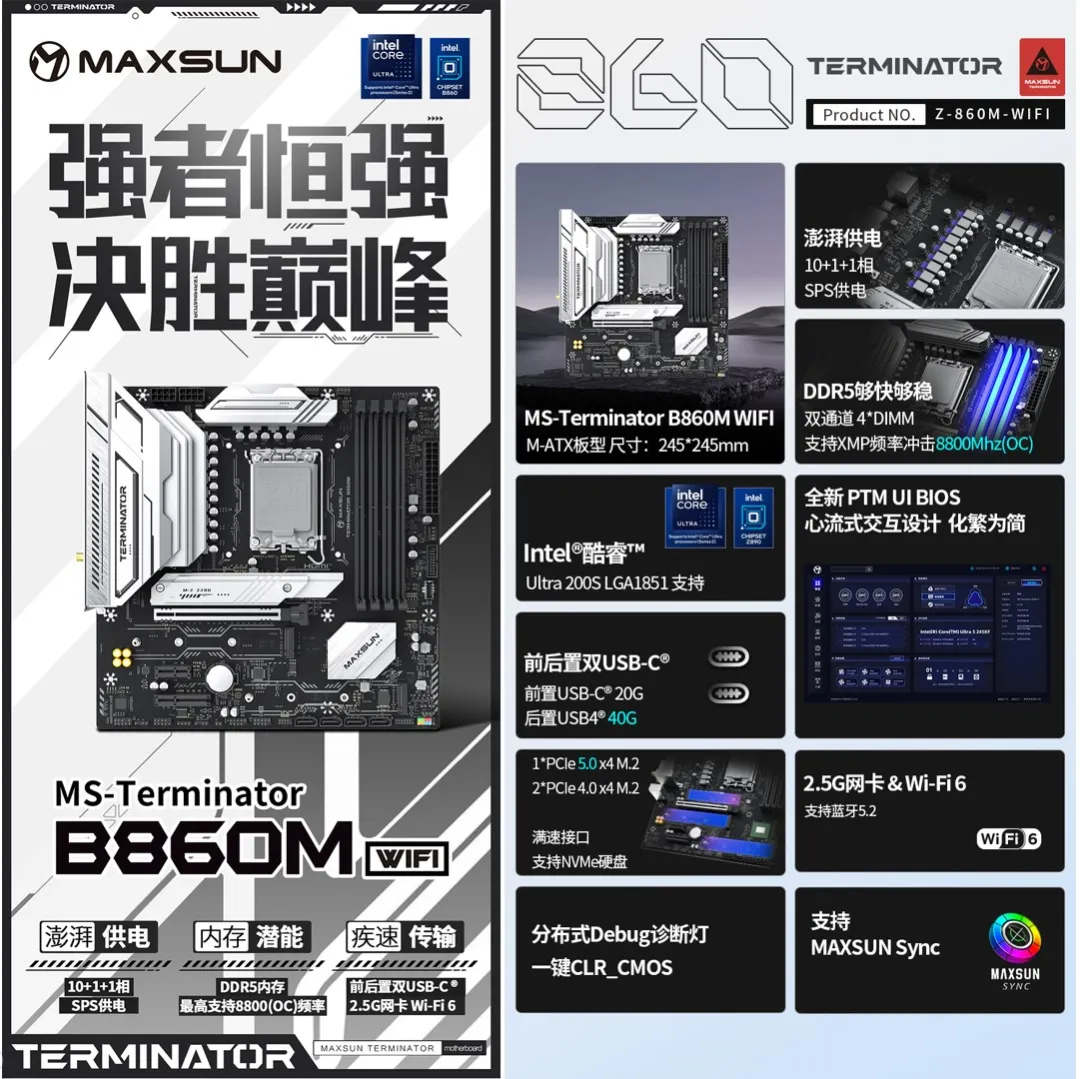 Terminator系列首發的MS-Terminator B860M WIFI 和 MS-Terminator B860M 兩款主板,以 10 + 1 + 1 相 60A SPS 供電設計實現更精準高效的電源調控。4 個 DIMM 高速 DDR5 內存插槽支持高達 8800 (OC) 頻率,前后置雙USB-C®接口,輕松連接各類設備,滿足用戶多元化需求。