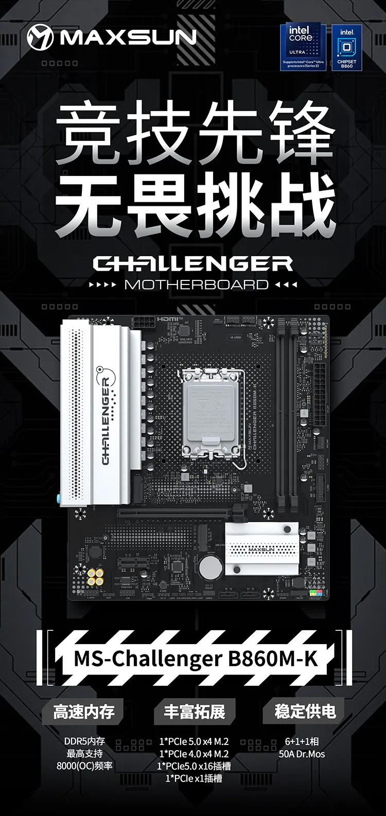 Challenger系列首發的MS-Challenger B860M-K同樣實力不凡,6+1+1相50A Dr.Mos穩定供電,2*M.2滿速接口,2*PCIe拓展插槽以及多達10個USB口,功能多樣且性能可靠。
