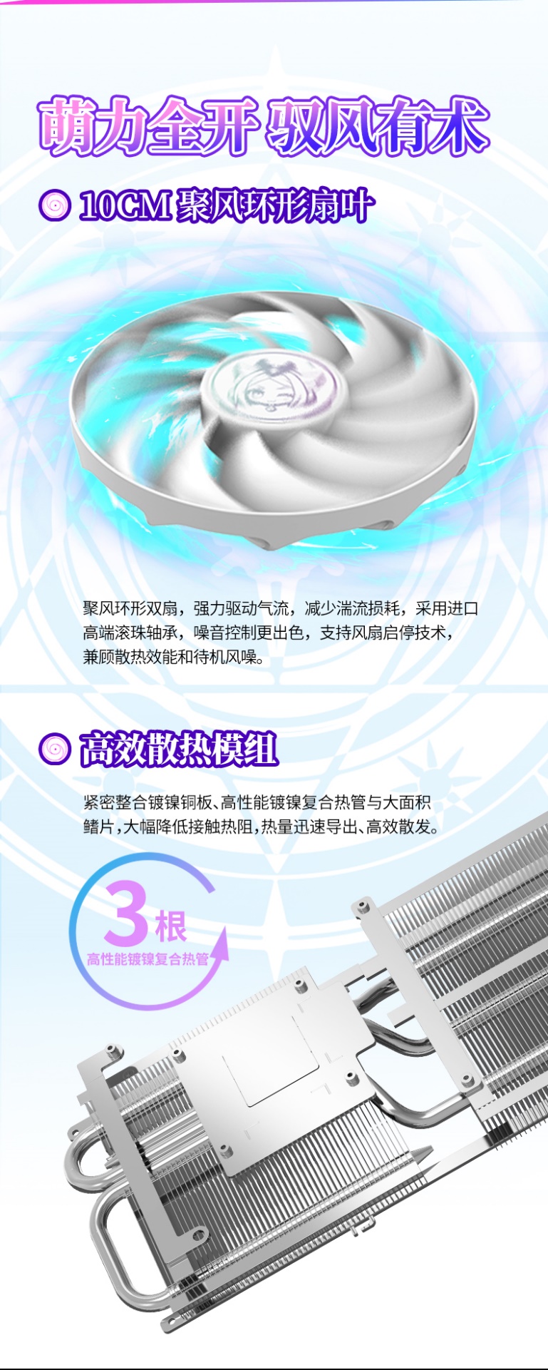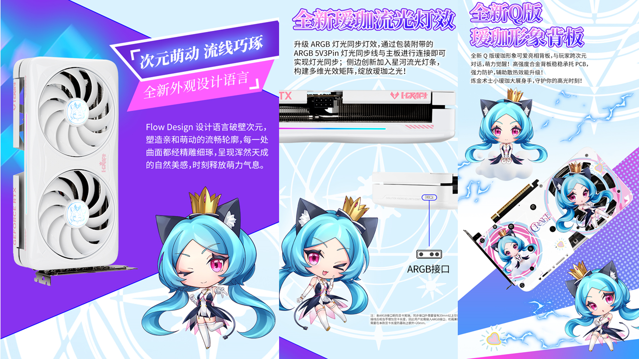 不止性能能打,這款顯卡的顏值更是戳中玩家的審美。它延續(xù)了璦珈系列標(biāo)志性的溫潤(rùn)白色外觀,采用 Flow Design 設(shè)計(jì)語(yǔ)言,每一處曲面都經(jīng)過(guò)精雕細(xì)琢,流暢的線條勾勒出親和萌動(dòng)的輪廓,放在主機(jī)里就像一件精致的潮玩擺件。側(cè)邊的璦珈流光燈效更是點(diǎn)睛之筆,炫彩的 ARGB 燈條支持燈光同步,你可以隨心切換燈光顏色和模式,讓顯卡和主機(jī)其他配件完美呼應(yīng),氛圍感直接拉滿。背板上的全新 Q 版璦珈形象更是萌力爆棚,煉金術(shù)士小璦珈仿佛在跨次元守護(hù)你的游戲時(shí)光。這塊高強(qiáng)度合金背板可不只是好看,它還能穩(wěn)穩(wěn)承托 PCB 板,有效防止顯卡變形,同時(shí)輔助散熱,顏值與實(shí)用兩手抓。