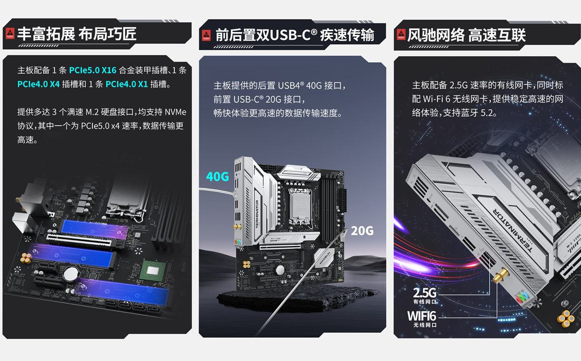 拓展性方面,銘瑄Terminator B860M WIFI主板堪稱 “全能選手”, 接口豐富且實(shí)用。 它配備 1 條 PCIe5.0 X16 合金裝甲插槽,有效防止因顯卡過重導(dǎo)致的插槽變形,給顯卡穩(wěn)穩(wěn)的支撐;同時(shí)還搭載 1 條 PCIe4.0 X4 插槽和 1 條 PCIe4.0 X1 插槽,可靈活連接萬兆網(wǎng)卡、擴(kuò)展卡等外設(shè)。存儲(chǔ)接口同樣充裕,提供 3 個(gè)滿速 M.2 硬盤接口,均支持 NVMe 協(xié)議,其中 1 個(gè)更是支持 PCIe5.0 x4 速率,海量存儲(chǔ)輕松擴(kuò)容,數(shù)據(jù)傳輸高速高效。后置 USB4 40G 接口與前置 USB-C 20G 接口的搭配,讓數(shù)據(jù)傳輸速度再上一個(gè)臺(tái)階,暢快體驗(yàn)無需等待。網(wǎng)絡(luò)體驗(yàn)也不拉胯!主板配備 2.5G 速率有線網(wǎng)卡和 Wi-Fi 6 無線網(wǎng)卡,同時(shí)支持藍(lán)牙 5.2,有線、無線雙模式自由選擇,無需額外升級。無論是有線連接的穩(wěn)定高速,還是無線連接的便捷靈活,都能有效避免網(wǎng)絡(luò)卡頓和延遲,不管是沉浸式游戲娛樂,還是高效遠(yuǎn)程辦公,都能輕松應(yīng)對。