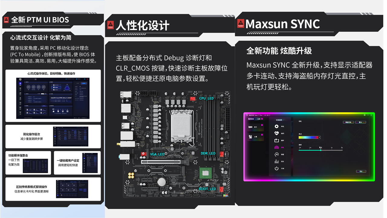 除了硬核配置,這款主板的貼心設(shè)計(jì),更是讓裝機(jī)和使用體驗(yàn)直接拉滿。全新升級的PTM UI BIOS,借鑒手機(jī) APP 的交互邏輯,采用模塊化設(shè)計(jì),交互層級不超過 2 層,手機(jī)端風(fēng)格的卡片式界面,讓復(fù)雜的 BIOS 設(shè)置變得簡單易懂,即使是新手玩家也能輕松上手。分布式 Debug 診斷燈和CLR_CMOS 快捷按鈕能快速定位故障,小白也能輕松排查問題,讓裝機(jī)全程省心省力,告別復(fù)雜操作。它還支持RGB光效同步,可與顯卡、內(nèi)存等外設(shè)實(shí)現(xiàn)燈光聯(lián)動(dòng),隨心切換炫酷燈光效果,無論是打造黑色電競主機(jī),還是組裝純白海景房,都能完美適配,輕松打造氛圍感拉滿的裝機(jī)效果。