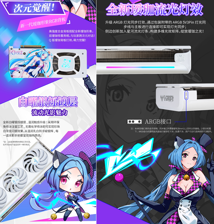不僅性能能打,銘瑄GeForce RTX 5060 Ti iCraft OC8G 璦珈顯卡的顏值更是戳中玩家審美。全新白曜銀爍鍍層,溫潤觸感升級,采用環(huán)保免噴涂注塑工藝,無需化學(xué)噴涂就能呈現(xiàn)珍珠白漸變閃銀效果,從溫潤乳白到冷峻銀輝,每一道光影折射都獨(dú)具質(zhì)感。搭配側(cè)邊創(chuàng)新加入的星河流光燈條,構(gòu)建出多維光效矩陣,配合升級的 ARGB 燈光同步功能,只需通過包裝附帶的 ARGB 5V 3Pin 燈光同步線與主板連接,就能實(shí)現(xiàn)燈光聯(lián)動(dòng),讓主機(jī)機(jī)箱瞬間變身 "次元舞臺(tái)"。高強(qiáng)度合金背板暗藏巧思,全新Q版璦珈形象萌趣十足,與正面白調(diào)形成呼應(yīng),個(gè)性化拉滿。