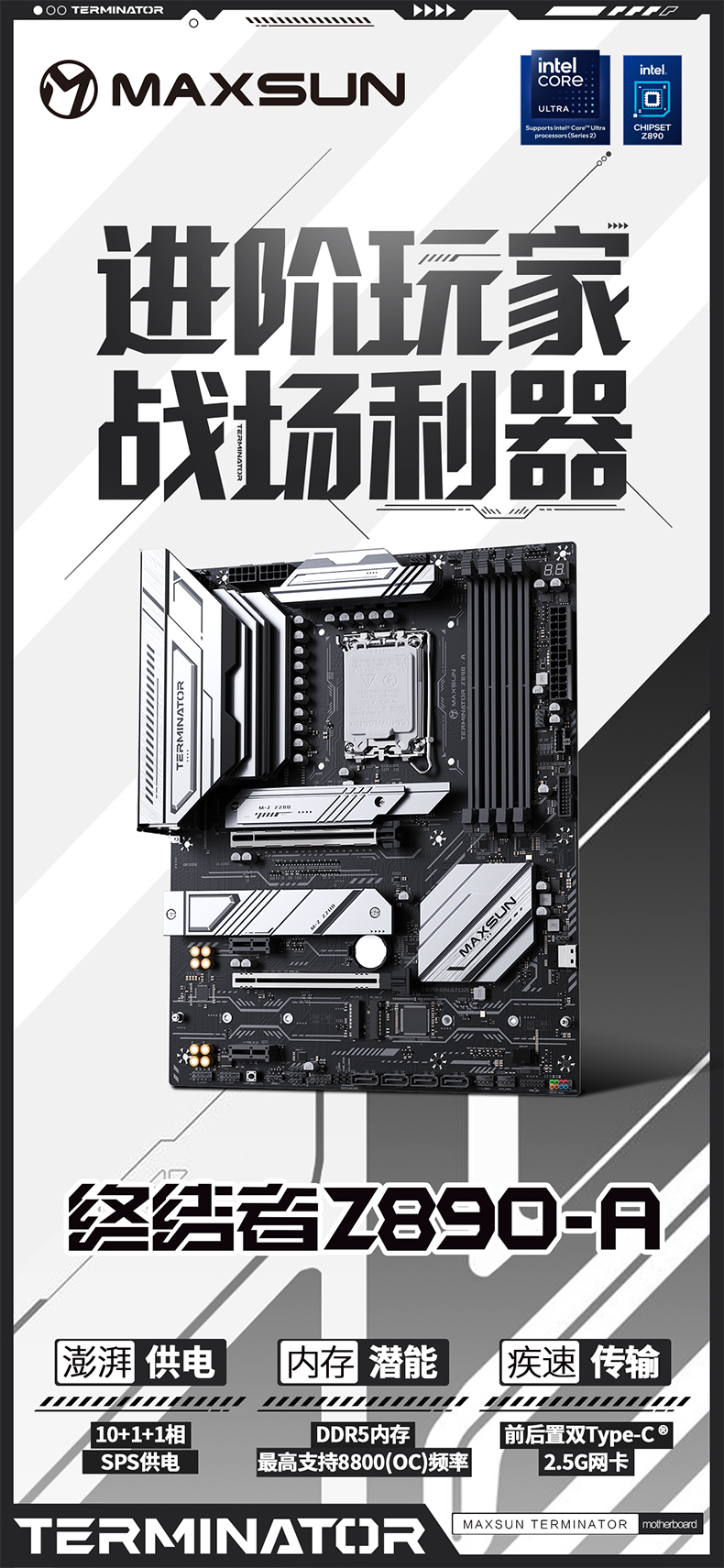 作為這款旗艦處理器的黃金搭檔,銘瑄 Terminator Z890-A 主板堪稱是為高性能電競體驗量身打造的硬核裝備。主板基于 Intel Z890 芯片組打造,搭載 LGA 1851 插槽,與酷睿 Ultra 7 270K Plus 處理器實現(xiàn)原生無縫兼容,從硬件底層保障了性能的充分釋放。在內(nèi)存超頻方面,這款主板實力出眾,可沖擊 8800MHz 高頻,輕松突破內(nèi)存性能上限;采用 8 層服務(wù)器級 PCB 設(shè)計,搭配背鉆工藝與菊鏈?zhǔn)絻?yōu)化布線,如同為高頻信號傳輸鋪設(shè)了一條 “高速專用通道”,能有效降低信號傳輸中的損耗與串?dāng)_,徹底消除電磁干擾與 Stub 效應(yīng),讓內(nèi)存的高速傳輸更穩(wěn)定、更流暢。內(nèi)存讀寫速度與多任務(wù)響應(yīng)速度的雙重提升,讓這款主板與酷睿 Ultra 7 270K Plus 處理器形成完美協(xié)同,共同實現(xiàn)了 15% 的游戲性能躍升,為電競高負載場景下的流暢運行提供了堅如磐石的硬件保障,讓玩家在激戰(zhàn)中告別卡頓,盡享絲滑操作體驗。
